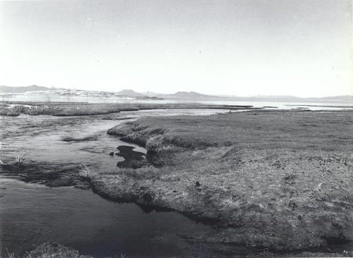 Rush Creek as it entered Mono Lake. Paoha Island is in the background to